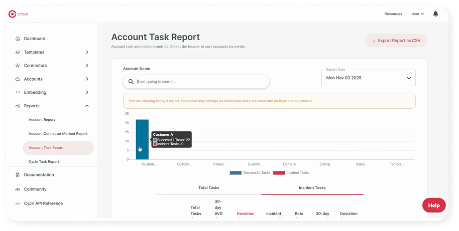 With pre-built dashboards and reports, you can easily monitor usage metrics such as the number of connected users, errors per account, and workflow activity. Once an integration template is updated, Cyclr can automatically deploy those updates across multiple customer accounts. As a result, streamlining delivery and minimising manual effort.